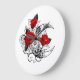 Contour, mechanical crescent moon with gears, decorated with red roses with black spiked stems and leaves on white background. Steampunk