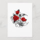 Contour, mechanical crescent moon with gears, decorated with red roses with black spiked stems and leaves on white background. Steampunk