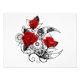 Contour, mechanical crescent moon with gears, decorated with red roses with black spiked stems and leaves on white background. Steampunk