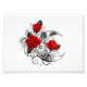 Contour, mechanical crescent moon with gears, decorated with red roses with black spiked stems and leaves on white background. Steampunk