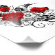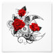 Contour, mechanical crescent moon with gears, decorated with red roses with black spiked stems and leaves on white background. Steampunk