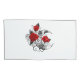 Contour, mechanical crescent moon with gears, decorated with red roses with black spiked stems and leaves on white background. Steampunk