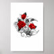 Contour, mechanical crescent moon with gears, decorated with red roses with black spiked stems and leaves on white background. Steampunk