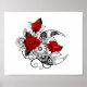 Contour, mechanical crescent moon with gears, decorated with red roses with black spiked stems and leaves on white background. Steampunk