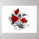 Contour, mechanical crescent moon with gears, decorated with red roses with black spiked stems and leaves on white background. Steampunk