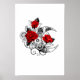Contour, mechanical crescent moon with gears, decorated with red roses with black spiked stems and leaves on white background. Steampunk