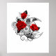 Contour, mechanical crescent moon with gears, decorated with red roses with black spiked stems and leaves on white background. Steampunk