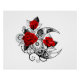 Contour, mechanical crescent moon with gears, decorated with red roses with black spiked stems and leaves on white background. Steampunk
