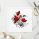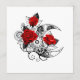 Contour, mechanical crescent moon with gears, decorated with red roses with black spiked stems and leaves on white background. Steampunk