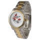 Contour, mechanical crescent moon with gears, decorated with red roses with black spiked stems and leaves on white background. Steampunk