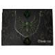 Mechanical elegance, the spider in the dark. Set against a deep, dark grey background, unfolds a mesmerising image of a spider that appears both graceful and sinister. Its body has a skeletal, almost mechanical appearance, enhanced by the use of shimmering green and gold tones. The spider's legs are long and slender, elegant in shape yet menacing in appearance.