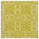 Ornate, mediaeval, fleur de lis and circle damask pattern fabric in deep mustard gold with a cream background