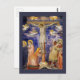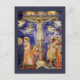 Mediaeval Good Friday scene with Christ on the Cross surrounded by angels. Richly coloured in blues, golden yellows and orange.