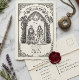 Embark on a fairytale journey with this enchanting mediaeval-themed 'Save the Date' card. Featuring a noble knight and his bride standing before a gothic archway, flanked by majestic dragons and a mystical unicorn, this design evokes a sense of timeless romance and adventure. The intricate hand-drawn style, reminiscent of ancient scrolls and tapestries, makes it a unique choice for couples planning a fantasy-inspired or Renaissance-themed wedding. Announce your special day with a touch of magic and historical charm.
