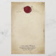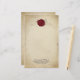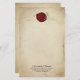 This custom stationary paper features a historical mediaeval theme. The background is a faded parchment paper design that resembles a mediaeval scroll. An ornate gold frame borders the paper. A red wax seal is placed at the top with a sample initial. A sample name and address are printed near the bottom. You can personalise the stationary to include your own initial and custom text.