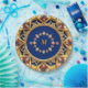 Golden ornament featuring vibrant gemstones and a formal blue layout. Its mediaeval decorative style exemplifies elegance and sophisticated design, ideal for themes of luxury, antiquity, or artistic inspiration.