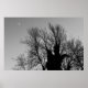 An atmospheric black and white photo of a tree silhouetted against a winter afternoon sky with a half moon. The tree seems to personify a strange nature spirit dancing to some kind of mediaeval music.