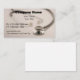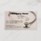 Medical business cards with photo of a stethoscope and text layout you can customise online. With a medical device on the template it would work well for a doctor, medical supply service, or health insurance company rep.