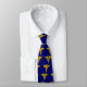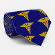 This blue necktie is decorated with multiple images of a gold caduceus.