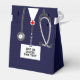 Medical-themed party favor boxes featuring navy-blue hospital scrubs, stethoscope, and Swiss Army knife. Edit text to personalize.