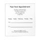 This notepad says "Your Next Appointment" at the top. Lines of black display text are available for the name of the medical practice, street address, phone number, and website. There are also lines for the date and time of the appointment. The bottom has display text you can edit to show a custom message. All text can be edited or deleted.