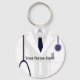 A graphic medical lab jacket design on a keychain. The keychain has a text templates for you personalisation. ©2013charmainepaulson