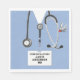 Creative medical school graduation party napkins featuring blue hospital scrubs, stethoscope and Swiss Army knife. Edit text to add doctor's name.