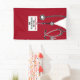 Creative doctor graduation party banner featuring red scrubs and congrats. Edit text to add physician's name and medical credentials.