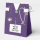 Creative medical doctor graduation party favour box gifts featuring purple hospital scrubs. Edit text to customise for doctor.