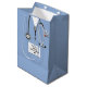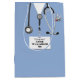 Creative doctor gift bag for medical school grad featuring hospital scrubs, stethoscope, and a Swiss Army knife. Edit text to add physician's name.