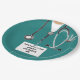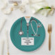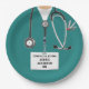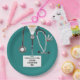 Unique doctor party plates for medical school grad featuring hospital scrubs, stethoscope and funny Swiss Army knife. Edit text to add doctor's name.