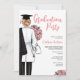 Medical School Graduation Party Invitation. The perfect doctor or nurse grad party Invitation for your daughter, niece, mother, aunt, cousin, or friend. Female Med School Graduation Invitation for grad parties celebrating women who just graduated from school of medicine, school of nursing or other medical profession certification. Featuring a portrait of woman with ight hair in a low bun, wearing lab coat with black graduation robe draped over one shoulder, and a bouquet of pretty pink flowers in her other hand, with a doctor's stethoscope slung around her arm. Pink script typography accents.
