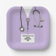 Unique medical-themed party plates featuring creative lavender hospital scrubs, stethoscope, and Swiss Army knife. Edit text to add doctor's name.