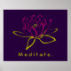 Meditate written underneath an outline of a lotus flower. Petals outlined in pink and the leaves outlined in green.