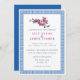 An elegant wedding invitation featuring a Greek key frame and a Mediterranean bougainvillea branch in cool Aegean / Mediterranean colours.