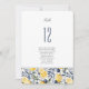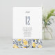 This table number card adds an elegant and refreshing touch to any wedding table setting, featuring a beautiful Mediterranean-inspired citrus and olive design against a blue and white azulejo tile background. The top of the card is simply adorned with the word "Table" in a graceful script, followed by a large, bold number that stands out for easy visibility. Below, the names of the guests designated to the table are listed in a clean, legible font. This card would beautifully complement a wedding theme that is vibrant and full of life, echoing the sunny coasts of Italy or the Grecian countryside.