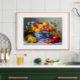 This vibrant still life features pomegranates, lemons, and oranges in an elegant blue and white ceramic bowl, accented with delicate white blossoms. A classic kitchen or dining room piece that brings warmth, color, and timeless European charm to any space.