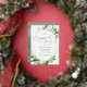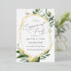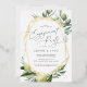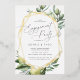 Beautiful nature theme engagement party invitations feature grey lettering framed by a gold foil geometric border and delicate watercolor illustrations of Mediterranean greenery, leaves, olives, and lemons. A modern choice in a natural colour scheme for boho or nature themed engagement celebrations.