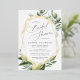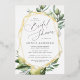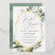 Beautiful nature theme bridal shower invitations feature grey lettering framed by a gold foil geometric border and delicate watercolor illustrations of Mediterranean greenery, leaves, olives, and lemons. A modern choice in a natural colour scheme for boho or nature themed bridal showers.