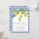 This elegant watercolor first birthday invitation has a blue and white tile frame with a white arch and lemon floral accents. It is modern, whimsical and dainty, making it the perfect invitation to celebrate.