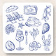 The best of the Mediterranean life - sea and food- a blue outline design, perfect for summer.
