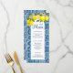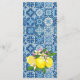 Modern and elegant white and blue menu card. The design features a pair of lemons with leafy stems and a Mediterranean tile background. Customise it easily with your wedding details.