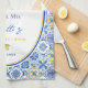 A kitchen towel for newlywed home featuring Mediterranean tile patterns, elegant script calligraphy, and a playful watercolor gelato ice cream design. Inspired by Italian coastal home decor and the sunny charm of the Amalfi Coast, this modern stylish kitchen towel captures the spirit of la dolce vita with bright blue and lemon citrus yellow tones and a relaxed Mediterranean summer aesthetic. Perfect for adding a chic, cheerful accent to a newlywed home, kitchen, or living space.
