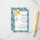 Mediterranean blue and yellow tiles and blooming lemon branch wedding details enclosure card. This wedding enclosure card brings the beauty of the Mediterranean to life. A bold blue and yellow tile pattern forms the backdrop, reminiscent of sunny Italian shores. A sprig of lemon branches, adorned with delicate blossoms, graces the upper left corner, adding a charming and elegant touch. The design, a blend of sophistication and playfulness, is the perfect prelude to your special day.