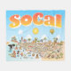 Bright and colourful scene offers a spectacular view of Southern California - wacky characters frolic on the beach and desert of SoCal showcasing Los Angeles, Long Beach, San Diego, Santa Barbara, Riverside, Palm Springs, Anaheim, and over 100 others, plus Anza Borrego and Joshua Tree parks as well as the border cities of Tijuana, Tecate and Mexicali. This charming scene has it all – a surfer hangs ten while a mermaid lounges on a rock, a killer whale leaps out of the water, zoo animals greet the tourists, a muscular beach couple both flex to impress as a T-Rex roars a challenge and a tank moves into position and much more…