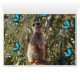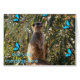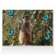 Featured in front of big green leaves is a Meerkat on guard duty with blue Butterflies.