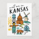 Discover the heart of the Midwest with this charming 'Meet Me in Kansas' postcard, featuring a delightful collection of Kansas icons in a fun doodle style! This whimsical illustrated postcard captures the essence of the Sunflower State, showcasing everything from golden corn fields and a friendly scarecrow to a classic windmill, a majestic capitol building, and a cosy farm scene. The playful illustrations and clear lettering make this postcard a unique and memorable tribute to Kansas, USA.