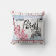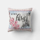 Pretty Paris-themed throw pillow with stripes, the Eiffel Tower, Cherry Blossoms and a simulated postage stamp that reads "Made with Love." Choose your size and fabric.