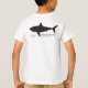 Colour illustration of the giant shark Megalodon on the front, black and white silhouette on the back.