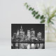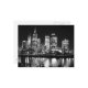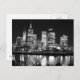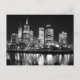 The postcard has captured the buildings at night in beautiful Melbourne, Australia. The black and white photo showcases the bright building lights reflecting off the Yarra River.
